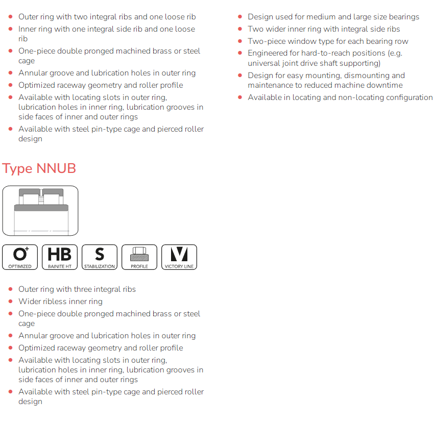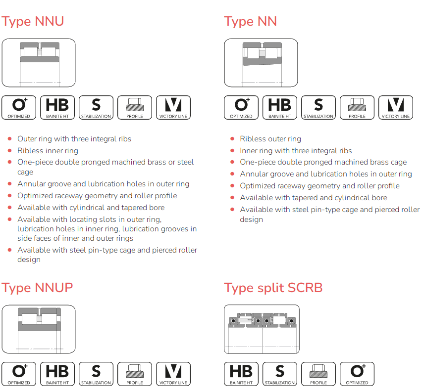 With a wide range of executions of double row cylindrical roller bearings, BUT is able to fulfill any requirement in demanding applications such as large size gearboxes, machine tools, grinding mills and crushers. To ensure superior performance, BUT double row cylindrical roller bearings are manufactured from high quality special steels, heat treated in optimized automatic lines. With improved internal geometry and profile, they can withstand high radial loads within a narrow cross section.