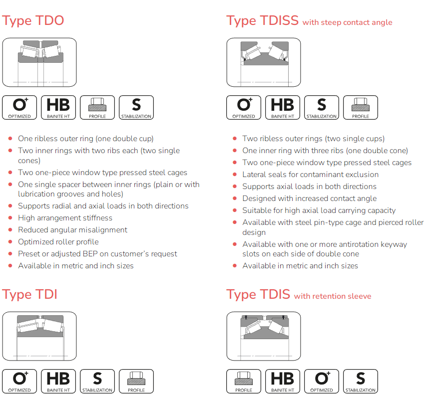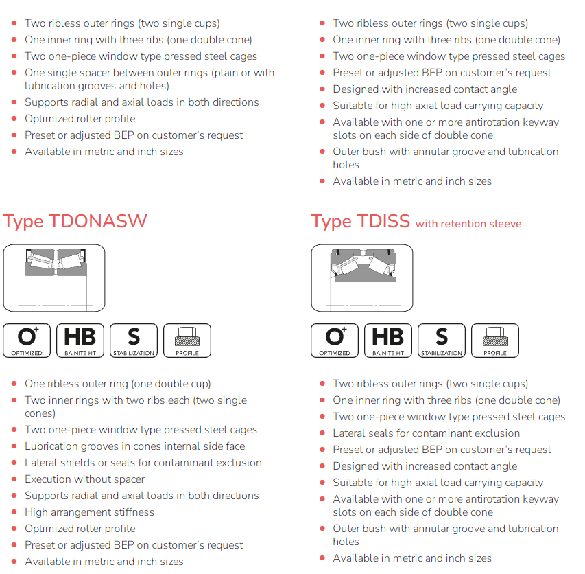 BUT double row tapered roller bearings are produced in several configurations (TDO, TDOS, TDI, TDIS) to support combined forces and locate the shaft in both directions. Manufactured with a given axial clearance (BEP), they can fully exploit their potential in a variety of applications. In order to manufacture products with the highest possible resistance to fatigue and wear, BUT makes use of different bearing steel grades and special heat treatments.